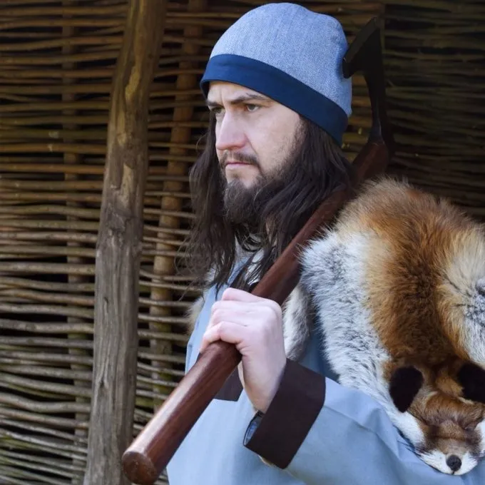 This replica of a Viking hat is based on textile fragments from Haithabu and Birka. These hats were made of fabric and sometimes also trimmed with fur, for extra warmth to the head. It is possible to decorate this hat yourself by adding fur or embroidery.
