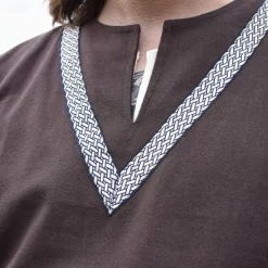 The Knut tunic is suitable for re-enacting, Cosplays and LARP from the Great Migration to the High Middle Ages. It is made of 100% cotton and has an ornate embroidered edge at the neckline. The tunic can be comfortably worn thanks to the split at the front and the extra fabric on the sides, also called gores. This makes the tunic perfect for fighting, running, climbing and horseback riding. The neck has a split, which can be worn open or closed with a fibula.