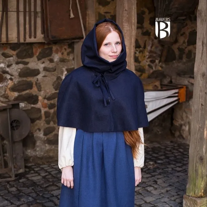 This chaperon is based on an original depicted in a medieval Book of Hours (daily prayer book) from approx. 1350 in the collection of the British Library. Chaperons like this were worn all over Europe. They protect the head and face from cold and rain. The manuscript illuminations show that this chaperon was even used for beekeeping! This chaperon ends in a long point over the back.