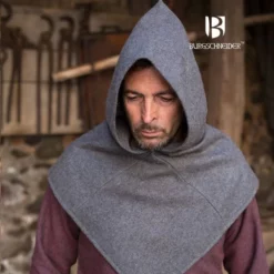 The chaperon became a gladly worn piece of clothing in the High Middle Ages. It protects the head, neck and shoulders from cold weather and rain. During the High Middle Ages they were worn by all classes of society and were often decorated and worn in bright colors. In the Late Middle Ages, their use was limited to the more common people who started to wear them in alternative ways. The liripipe for example, which used to hang from the back, was later wrapped around the neck.