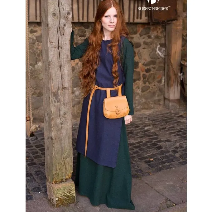 This hangeroc is a replica of the 9th century original excavated in Haithabu. The hangeroc was the garment that Viking women worn over their dress and they brought this costume to Iceland, Ireland, Russia and the British isles. The hangeroc was often fastened to the dress with shield brooches or disc fibulae.