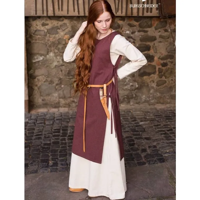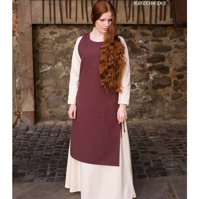 This hangeroc is a replica of the 9th century original excavated in Haithabu. The hangeroc was the garment that Viking women worn over their dress and they brought this costume to Iceland, Ireland, Russia and the British isles. The hangeroc was often fastened to the dress with shield brooches or disc fibulae.