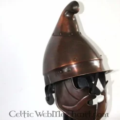 This helmet is made after a late-Roman equestrian helmet found in Rainau-Buch (Germany). Although it closely resembles a galea, the ordinary legionary helmet, this model is more streamlined and the cheek protectors are bigger.