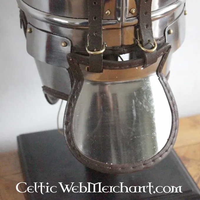 This steel replica is made after an original from Burgh Castle, Norfolk, England from the 3th-4th century AD. The later Roman helmet types weren?t based on Celtic designs anymore, but presumably on the helmets from the Persian Empire, which was emerging in that period. Around the 2nd century AD the cavalry had become an essential part of the Roman army, although it remained a vulnerable unit, one fifth of the army consisted of cavalry.