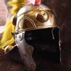A luxurious and beautiful Roman helmet, a masterpiece for your Roman helmet collection. This is a replica of an original from 50-75 AD. which was found around 1870 in Witcham Gravel, England. The original is currently on display at the British Museum, London. It is classified as a Roman auxiliae cavalry type B helmet and is the only surviving example of the type B helmets. It also has characteristics of the Imperial galea. The helmet is made of 1.2mm (18 gauge) steel with brass centerpiece and decorations. The cheek flaps have rings so that you can use a leather lace for fastening the helmet. The yellow helmet crest, or crista, is based on an example in the Ars Tactica by the Greek historian Arrian. The helmet crest is made of real horsehair and is delivered including 3 screws for attaching it to the helmet, the holes in the helmet are already pre-drilled.