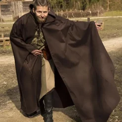 This cloak is made of cotton twill and protects you against rain, wind and the sun when you are out all day. The cloak offers a good mobility for the arms so that you can also wear it in battles. With the cotton lace you can fasten the cloak around your neck. On the back it has a hood to protect the head. This long cloak falls to the ankles or shoes, so you can even sleep in it. Cloaks like this were worn from the early Middle Ages to the Renaissance so it is suitable for re-enactment of several historical periods and also for fantasy and LARP.