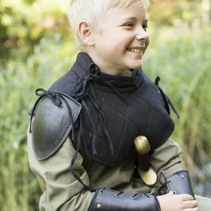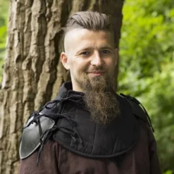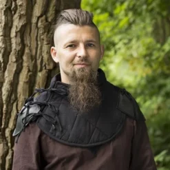 You can wear the gorget as extra protection with your gambeson or LARP armor. The set weighs less than a kilo so with the collar and pauldrons you are quick and agile. You can attach the pauldrons to the collar with laces, so the collar and pauldrons can also be used separately.