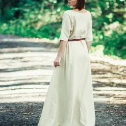 Universal dresses like this were worn by different people in Europe from the early to the high Middle Ages. Remnants of originals have been found and many images have been preserved in medieval manuscripts. Because the dress is suitable for different periods, you can adapt it to your own wishes with accessories such as belts, bags and surcottes. This way you can use it for several outfits. The dress has a V-neck and short sleeves. That’s why it’s great for hot days. You can use it as a slip dress, wear it separately or combine it with a hangeroc, apron or surcotte.
