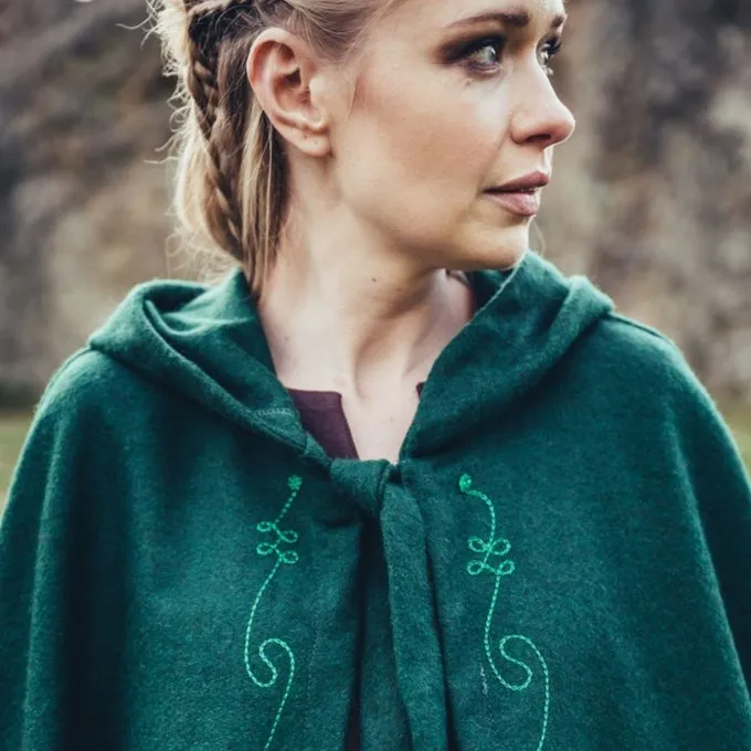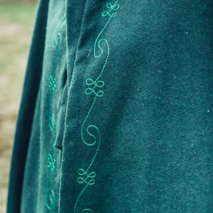 This wool mix cloak has edges with elegantly embroidered patterns. Suitable for both re-enactment and LARP. The cloak has straps at the front for fastening.