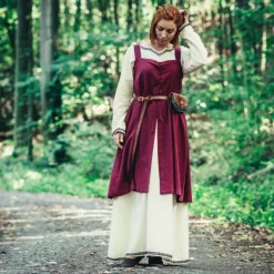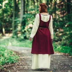The hangeroc is a type of dress that was worn by Vikings and other early medieval people over a slip dress. The hangeroc was originally worn with turtle brooches, to fasten the front to the shoulders. The shoulder part was often much longer and shield brooches were used to lift up the front fabric just above the breasts. Most modern hangeroc reproduction already are the correct length, so turtle brooches are often not needed for practical purposes. But you can just wear the turtle brooches as decoration, or to still lift up the front part of the hangeroc to your taste. Between the shield brooch, women wore a number of strands with colored beads. They also wore a belt over the hangeroc, this gave more shape to the garment but was also useful for hanging the key, a pouch, a knife, etc. This hangeroc is open at the front. You can fasten it with the cotton laces on the front, you can also use them to create a tighter fit.