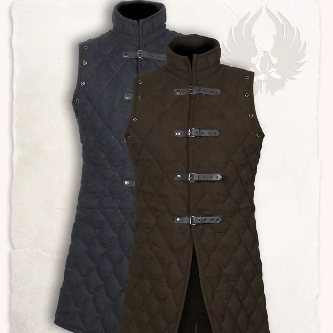 This sleeveless gambeson is ideal for creating a LARP or reenactment character. The gambeson has leather straps at the front that are closed with buckles. The outside of this gambeson is made of rough woven cotton canvas. It has a polyester padding. At the arms, this gambeson has lace holes for fastening the matching Arthur gambeson arms or armour parts.