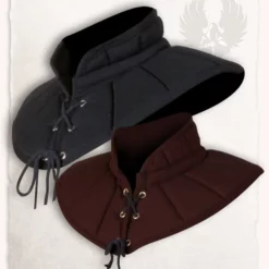 Gambeson gorgets like this were worn during the Middle Ages. They are depicted in the Morgan bible and other medieval visual art. The Leopold gambeson gorget has been developed to protect the neck during reenactment and LARP battles. At the front, it can be tied with laces. The gambeson gorget is perfect for wearing under chainmail or large helmets like the armets and bascinets. This gambeson gorget has an exterior made of rough woven canvas with a polyester padding.