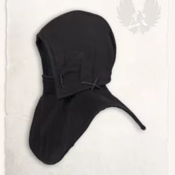In the Middle Ages, knights and foot soldiers often wore gambeson hoods and collars like this. This hood and collar are made after examples from the Morgan Bible. This gambeson hood and collar can be worn separately as well as under armor and helmets. They can be attached to each other with leather straps. Both are made of rough woven canvas and have a wool felt / polyester padding.