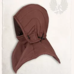 In the Middle Ages, knights and foot soldiers often wore gambeson hoods and collars like this. This hood and collar are made after examples from the Morgan Bible. This gambeson hood and collar can be worn separately as well as under armor and helmets. They can be attached to each other with leather straps. Both are made of rough woven canvas and have a wool felt / polyester padding.