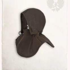 This set consists of a gambeson hood and collar. Both are made of rough woven linen and have a padding of wool felt, with a cotton lining. Both can be tied together with leather laces. Gambeson parts like this were already worn in the High Middle Ages, several examples are depicted in the Morgan Bible and the Manesse codex.