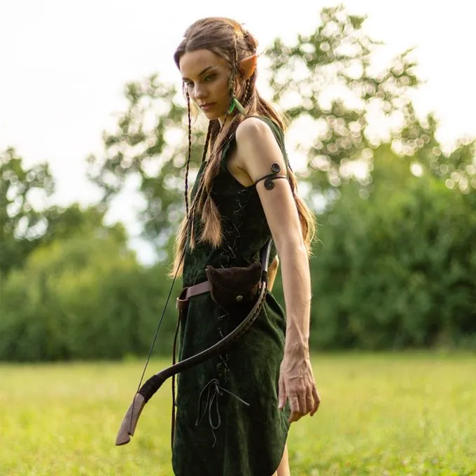 This dress is suitable for reenactment, cosplay and LARP. The dress is made of suede leather. The dress has a lacing. This ensures that the dress can adapt to the model of the wearer. The dress has a quirky design which makes it playful, but mainly unique.