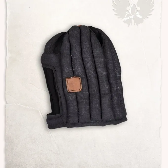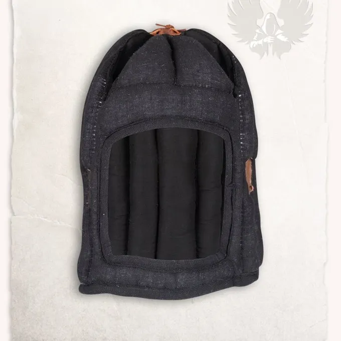 This arming cap is based on a 15th century original that is now part of the collection in the Hofjagd und rüstkammer in Vienna. The arming cap protects the entire head and has leather reinforcements at the ears. The top is closed with a leather lace, so it can be adjusted to size. This arming cap is made of rough woven linen and cotton mix with a wool felt padding. This arming cap can be worn under the bascinet, great helmet, bucket helmet, armet and under some types of sallets.