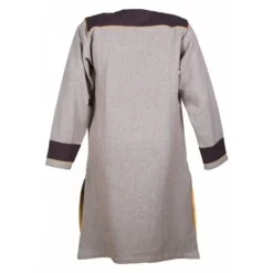 This tunic is perfect for re-enacting and cosplaying of early medieval people in Western Europe such as Vikings, Merovingians and Franks. The tunic falls to the knee and is made of sturdy cotton. The fabric strips that adorn the sleeves and neckline also fit in early medieval fashion.