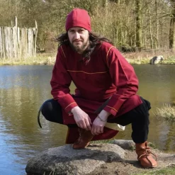This tunic is perfect for re-enacting and cosplaying of early medieval people in Western Europe such as Vikings, Merovingians and Franks. The tunic falls to the knee and is made of sturdy cotton. The fabric strips that adorn the sleeves and neckline also fit in early medieval fashion.
